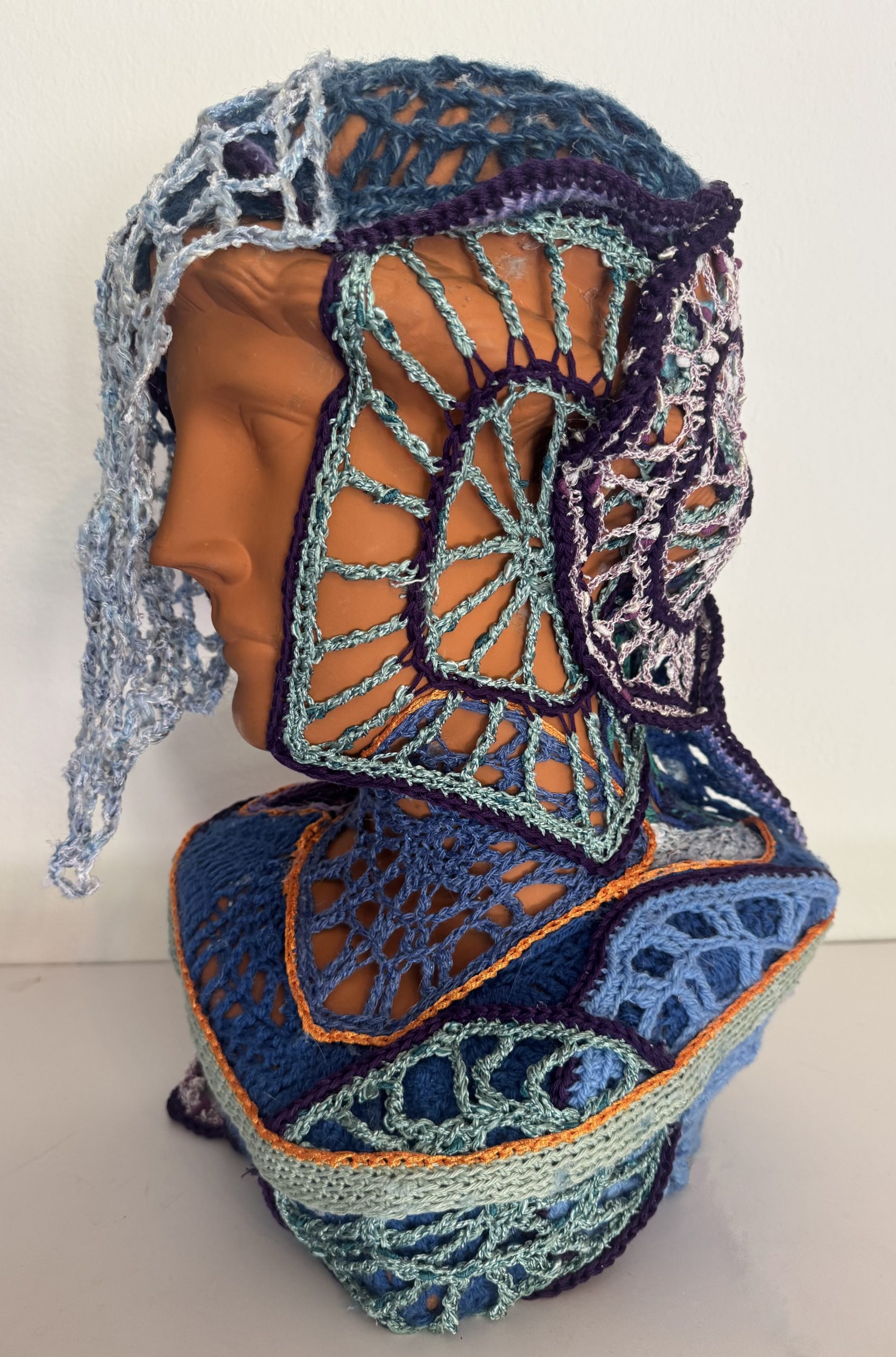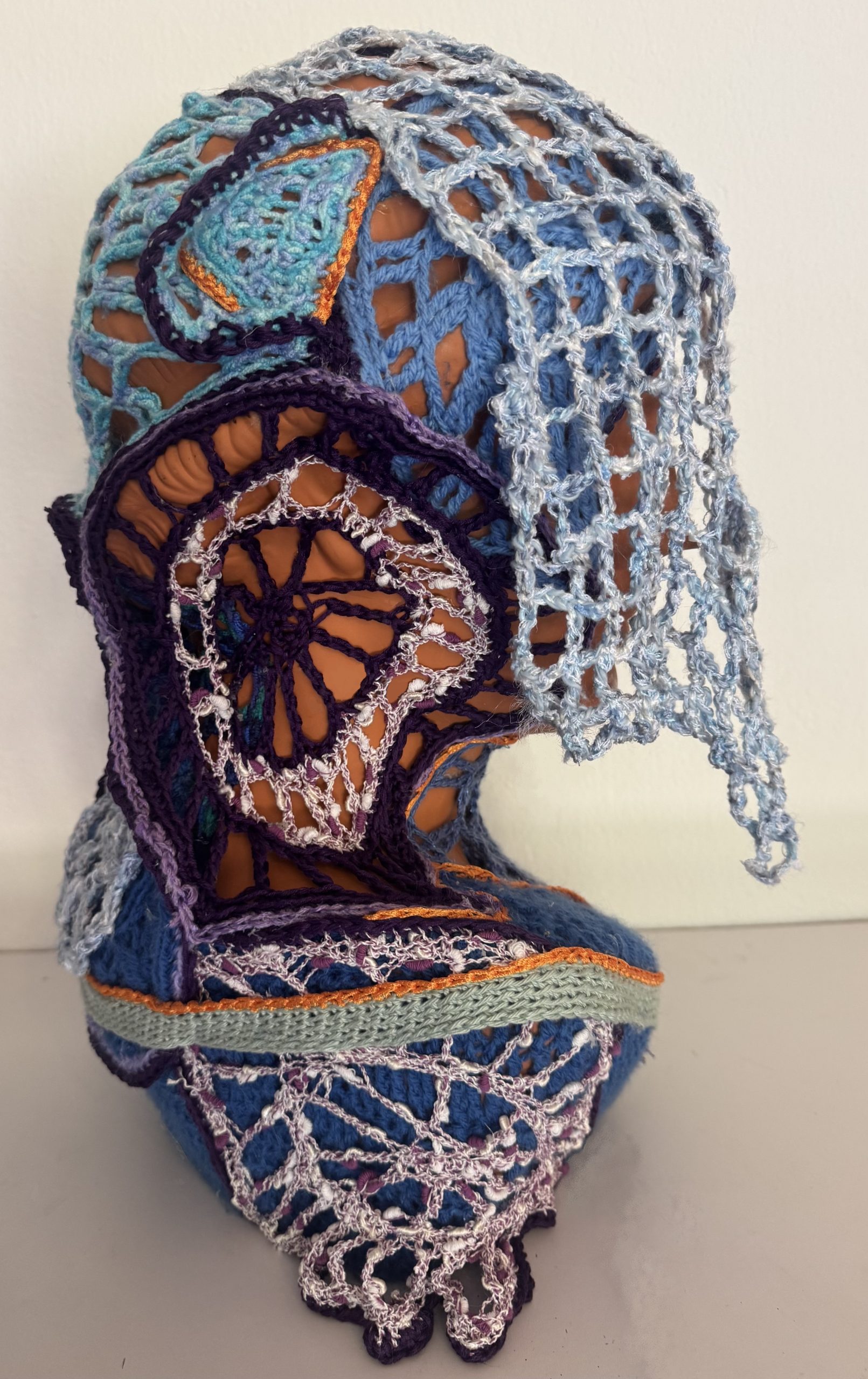 Mir gefällt an der Arbeit mit mir geschenkten gebrauchten Kleidungsstücken, Stoffen und Wollen besonders der Umgang mit dem weichem formbaren Material und die Vorstellung, könnten die Stoffe reden, würden sie mir spannende Geschichten aus anderen Zeiten erzählen. Ich kreiere gern Objekte, die in ihrer Mehrdimensionalität von diesen verschiedenen Zeit- oder/und Bewegungsebenen erzählen. Sie finden sowohl Häkel- als auch Näh- und Stickarbeiten. Auch hier kreiere ich Neues aus einem bunten Materialmix: Stoffe und Wollen „unterhalten“ sich mit Keramik, Kunstharz, Holz, Draht.